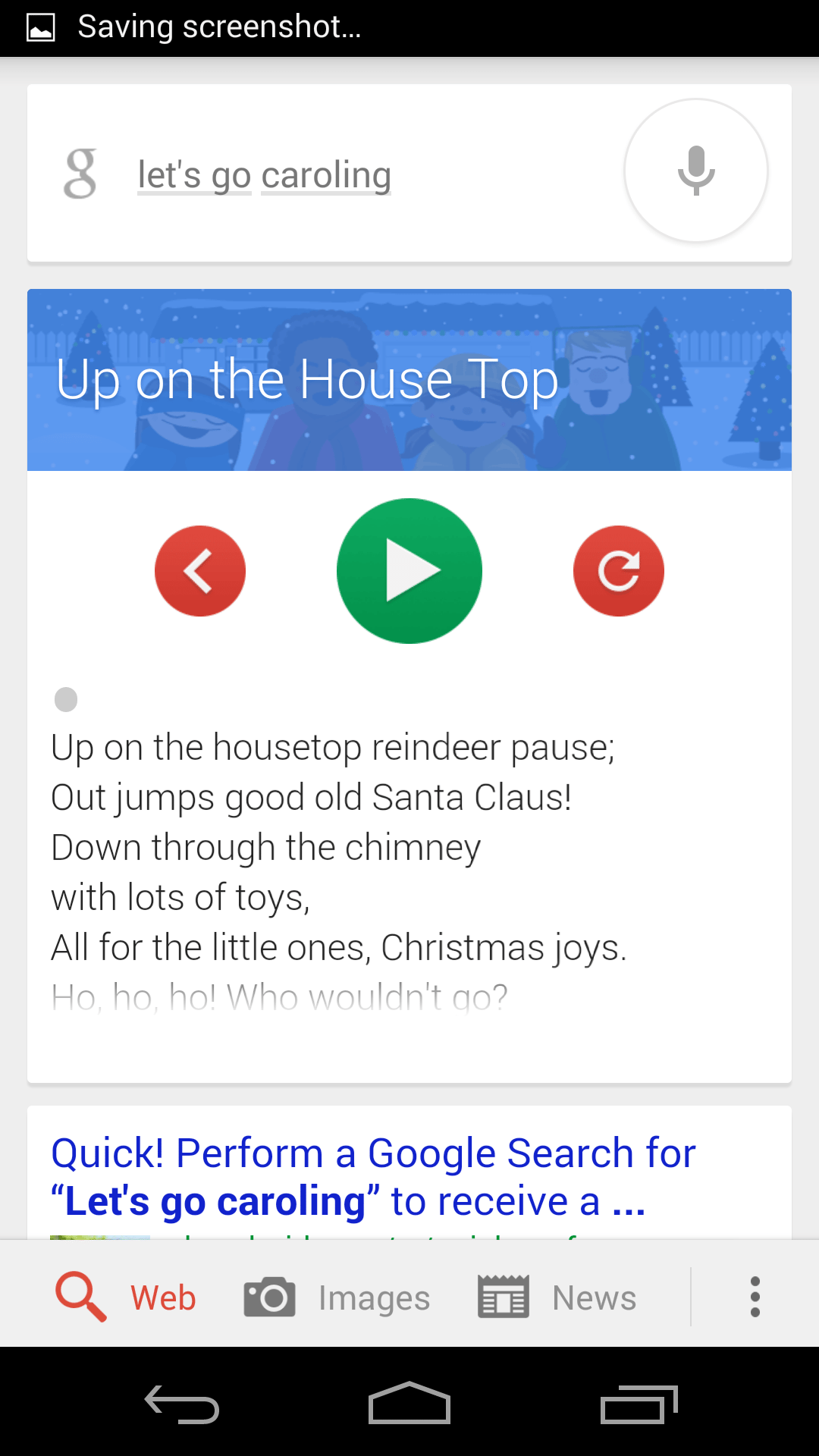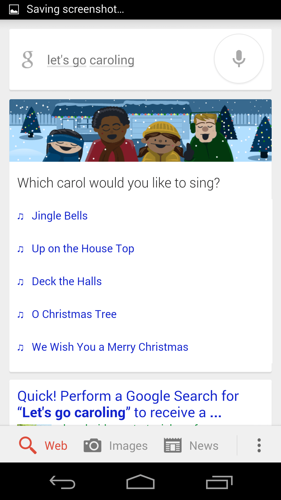 Google often likes to throw little easter eggs into their services and a fun and festive one has made its way to Android devices recently! If you jump into Google Search/Google Now and say the command, “let’s go caroling,” you will be prompted with a list of songs to sing along to.