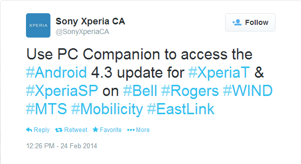 In the midst of all the MWC announcements going on we’ve got some fun update news to report to you. According to Sony Canada’s Twitter page, the Android 4.3 update is ready for the Xperia T and Xperia SP on Bell, Rogers, Wind, MTS, Mobilicity, and EastLink.