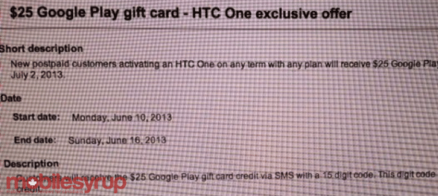 If you’re thinking of picking up a HTC One from Bell in the near future you may want to hold out just a little bit. According to a screen shot sent over to MobileSyrup, Bell will be offering a $25 Google Play Gift Card with the purchase of a HTC One on any term. The promo runs from June 10-June 16 and it looks like you’ll be receiving the Gift Card code through a text message. So if you were thinking to buy, just hold out a couple of days and you can land yourself a sweet $25 for apps and games!