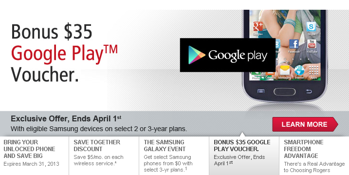 We have been informed by our liaison at Rogers that they are now offering up a nice little incentive to get you into a new Samsung Galaxy smart phone. From now until April 1 you can snag a $35 Google Play voucher when you pick up a new phone on a new 2-year or 3-year contract with a minimum $45/month plan.